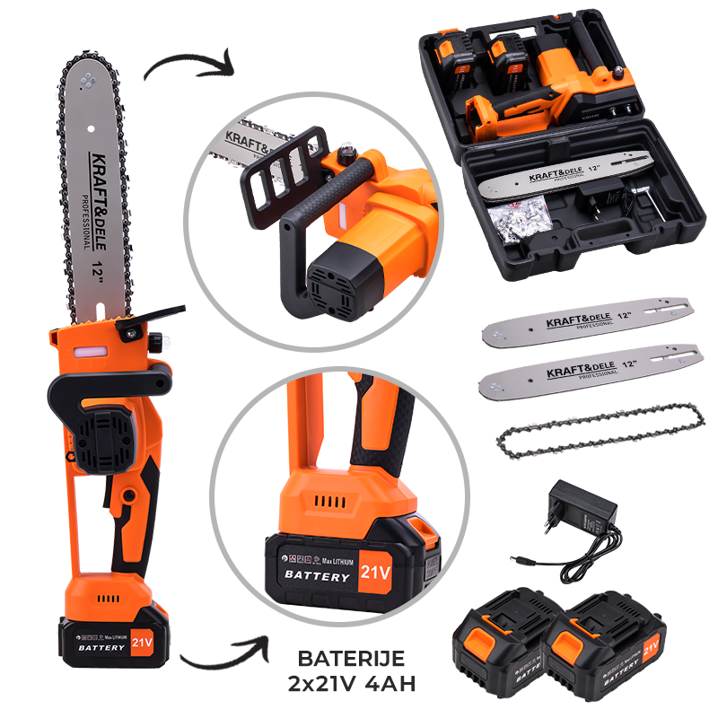 Profesionalna akumulatorska žaga Kraft&Dele je popolno orodje za delo na vrtu in v sadovnjaku. Zahvaljujoč dvema zmogljivima 21V 4Ah baterijama omogoča popolno svobodo gibanja brez kablov in potrebe po gorivu. Idealna je izbira za rezanje vej, pripravo drv in manjša lesarska dela.