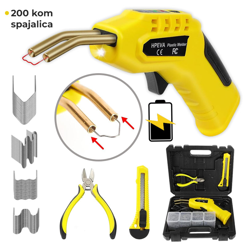 Ta prenosni in brezžični aparat za varjenje plastike omogoča maksimalno prilagodljivost in enostavno uporabo. Zahvaljujoč zmogljivi bateriji 4,0 Ah in vgrajeni LED osvetlitvi zagotavlja varno in natančno delo tudi v slabše osvetljenih pogojih. S priloženimi 200 sponkami je ta komplet idealen za hitro in zanesljivo popravilo avtomobilskih plastičnih delov, kot so odbijači, spojlerji, ohišja luči in druge komponente.