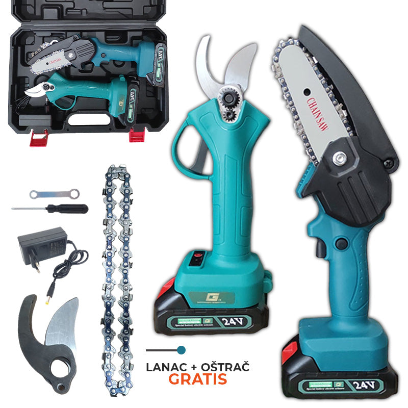 Dva u jedan dizajn: Ovaj set kombinira aku pilu i aku škare za orezivanje u jednom, što omogu?uje višenamjensku upotrebu i prakti?nost u radu.