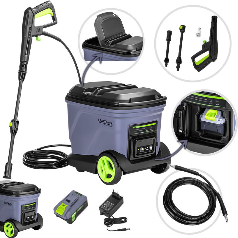 Akumulatorski visokotlačni perač , pruža potpunu slobodu čišćenja zahvaljujući spremniku od 20 litara i snažnom motoru. Baterija 42V 3000mAh osigurava dugi rad bez priključivanja na struju, dok maksimalni tlak od 200 bar i protok 260 l/h bez problema uklanjaju tvrdokornu prljavštinu.