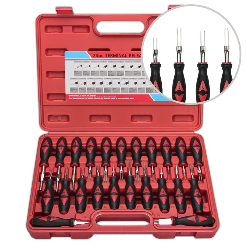 Set alata za otpuštanje terminala od 22 dijela savršen je alat za profesionalne elektri?are, automehani?are i tehni?are koji rade na elektri?nim instalacijama. Njegov dizajn omogu?uje sigurno i brzo otpuštanje terminala bez ošte?enja konektora, kablova ili pinova, ?ime se olakšava popravak i održavanje elektri?nih sistema.