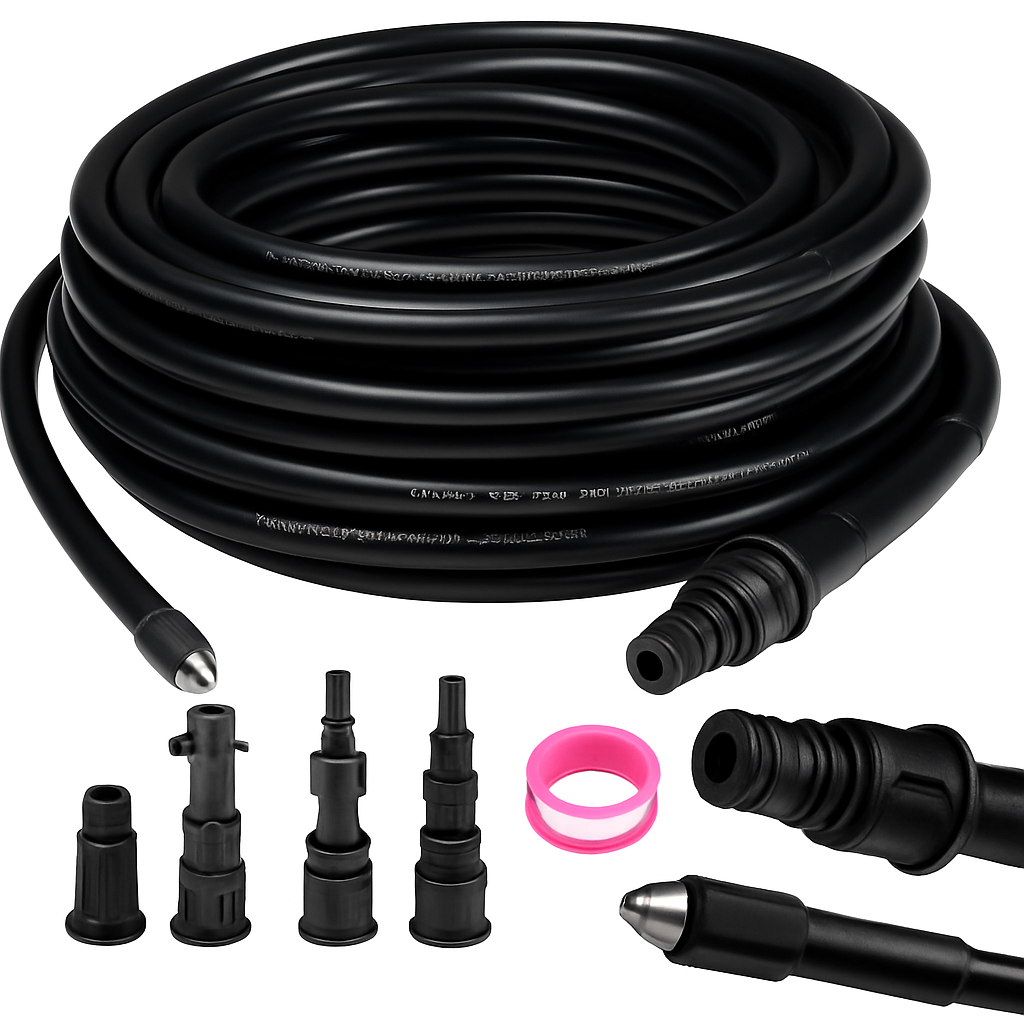 Praktičan i učinkovit set za čišćenje cijevi, odvoda i kanalizacijskih instalacija bez potrebe za kemikalijama ili kompliciranim demontažama. Dovoljno je priključiti crijevo na visokotlačnu perilicu i voda pod snažnim pritiskom uklanja prljavštinu, masnoću i začepljenja.