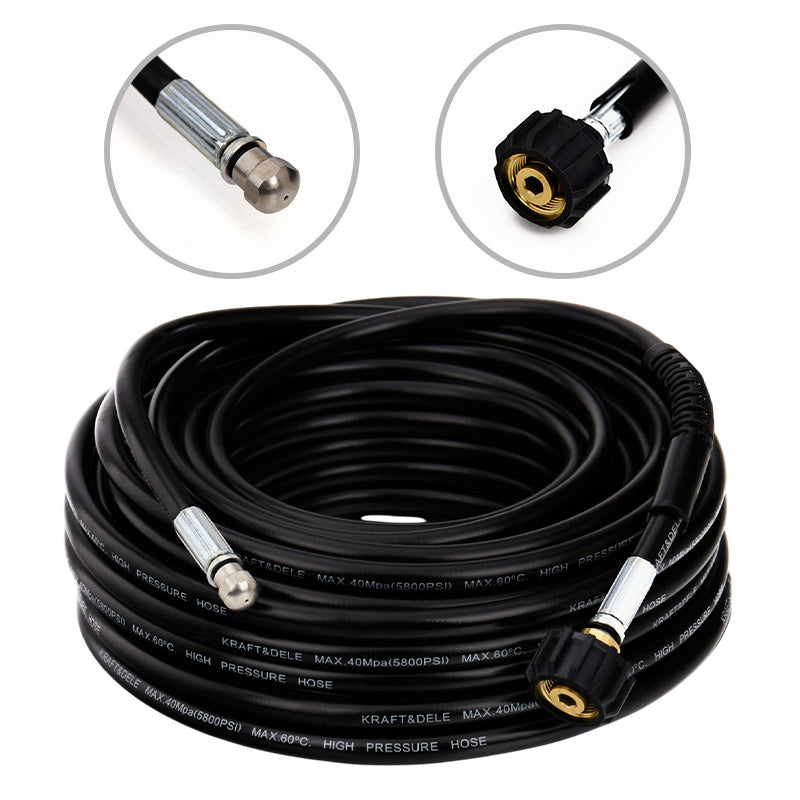 Cev za čiščenje kanalizacije Kraft&Dele dolžine 20 metrov je namenjena visokotlačnim čistilcem za učinkovito čiščenje in odmaševanje kanalizacijskih in odtočnih cevi. Zahvaljujoč medeninasti šobi s posebnim sferičnim oblikom omogoča močan udarec na zamašitve ter zlahka prehaja skozi ovinke in zožitve v ceveh.