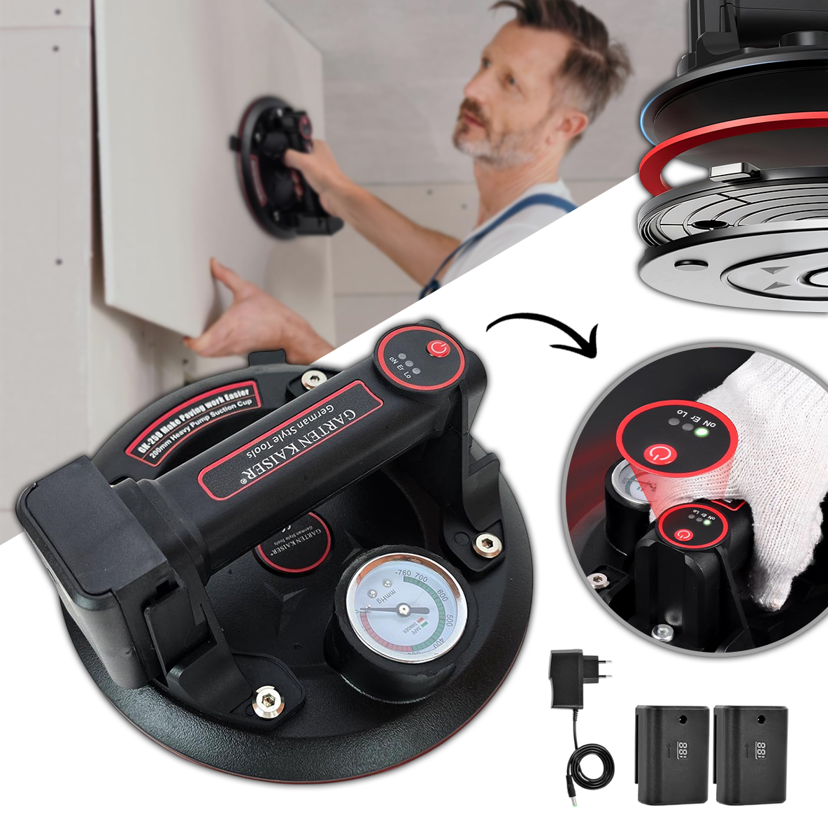 Zahvaljujući promjeru usisne površine od 20 cm i ergonomskom dizajnu, alat omogućuje ravnomjerno prijanjanje i smanjeni zamor ruku tijekom rada. Dolazi s dvije baterije koje osiguravaju dugotrajan rad bez prekida, a jednostavan sustav otpuštanja vakuuma pritiskom na tipku čini ga sigurnim i jednostavnim za uporabu.