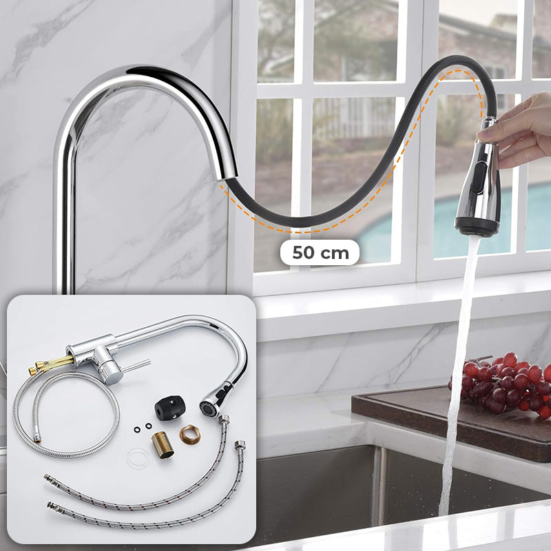 Ta kuhinjska pipa je fantastična izbira za vsako kuhinjo! Njena elegantna zasnova se popolnoma prilega vsakemu prostoru, hkrati pa ponuja dodatno funkcionalnost zahvaljujoč sistemu izvlečne cevi in možnosti spreminjanja curka vode, kar olajša uporabo in naredi pomivanje posode manj naporno.