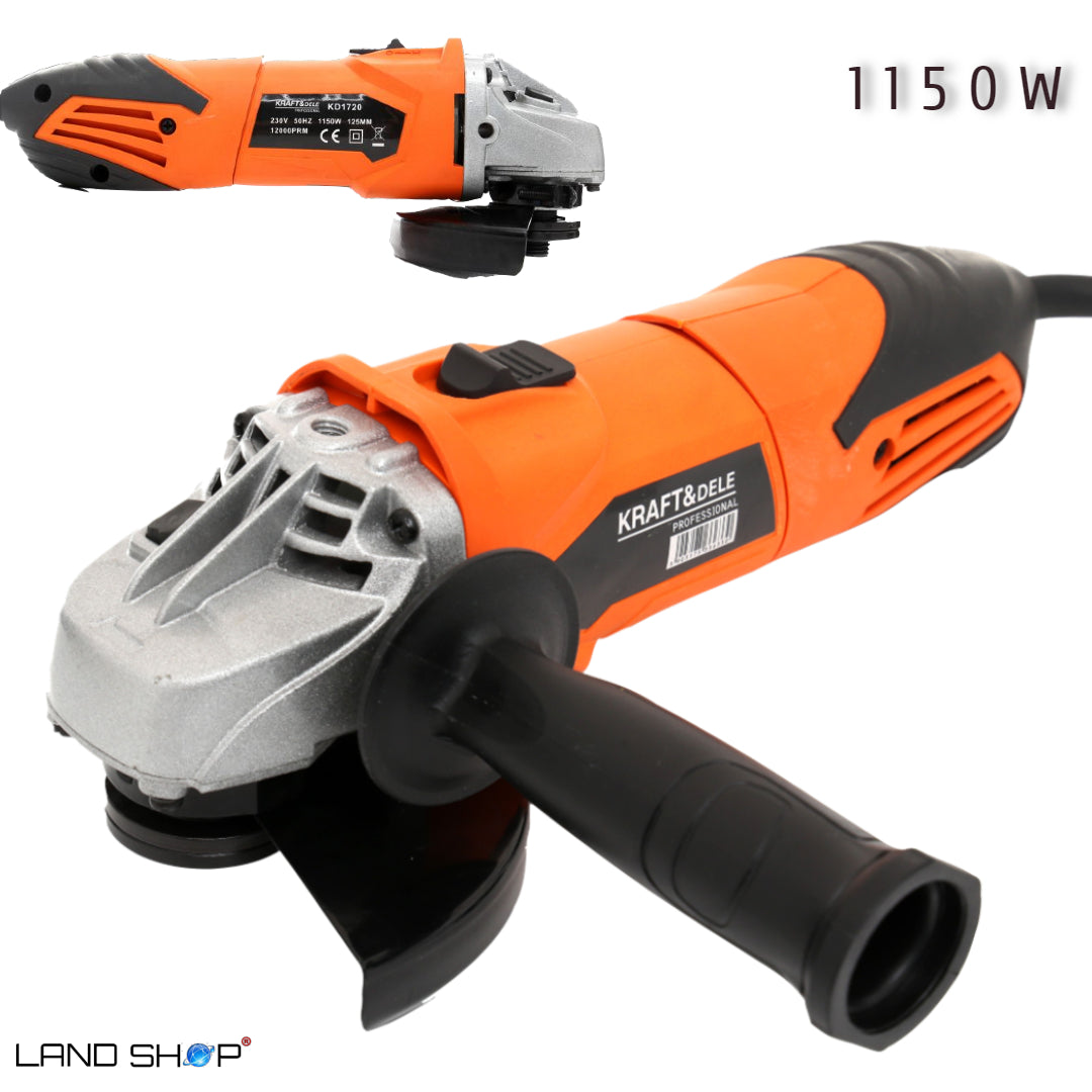 Kraft & Dele kutna brusilica namijenjena za rezanje, brušenje i poliranje materijala kao što su metal, drvo, beton, plastika, keramika, kamen i mnogi drugi. Opremljen je motorom snage 1150W, što mu omogu?uje uporabu svih vrsta diskova, ?etkica i brusnih diskova promjera do 125 mm. Snaga motora omogu?uje brzinu rotacije od 12000 okr / min.