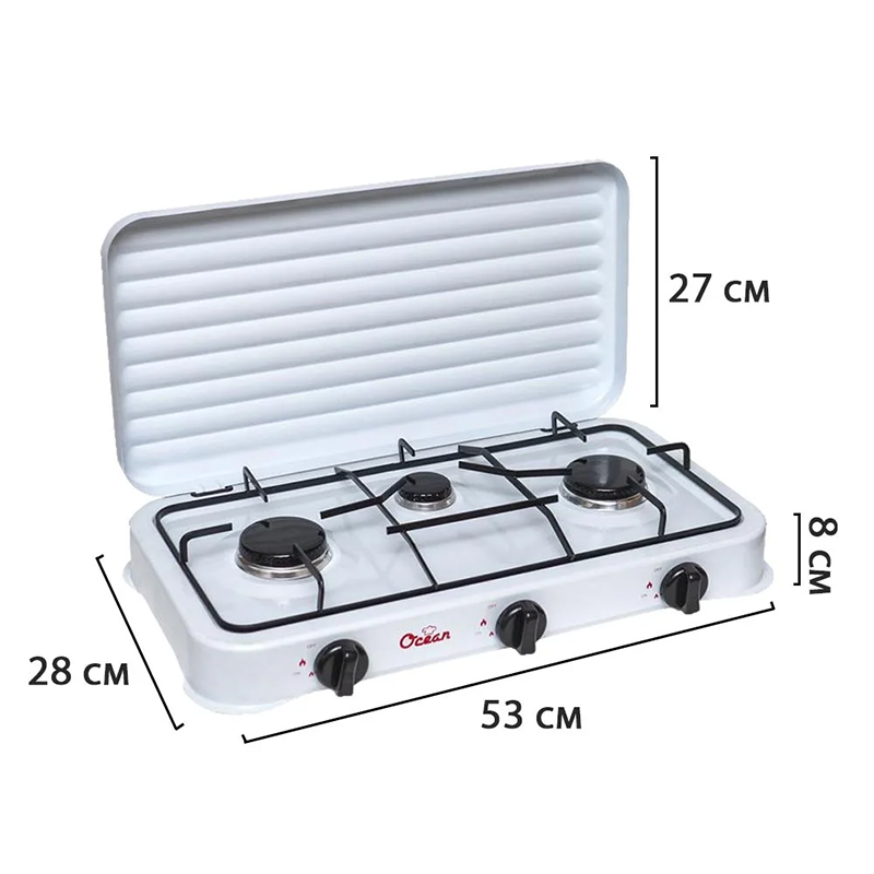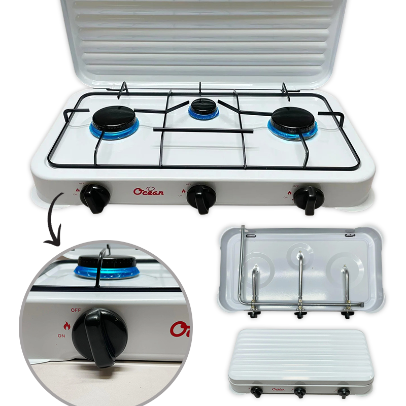 Namizni plinski štedilnik s 3 gorilniki Ocean je idealen za kampiranje, potovanja, ribolov, lov ali uporabo na vikendicah in v manjših kuhinjah. Njegova kompaktna in lahka zasnova omogoča enostavno prenašanje in postavitev, kjer koli je potrebno.