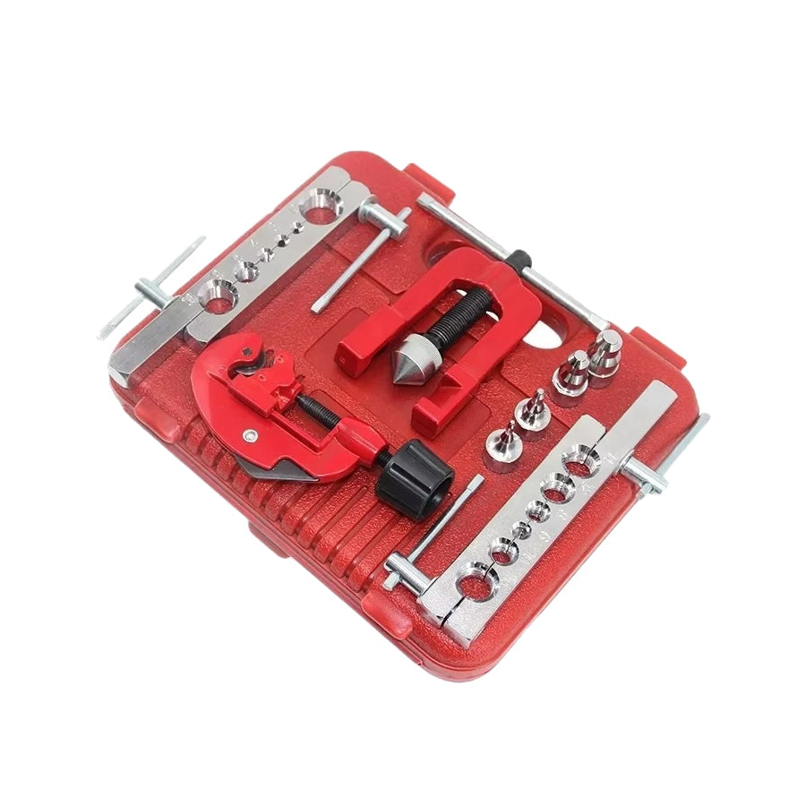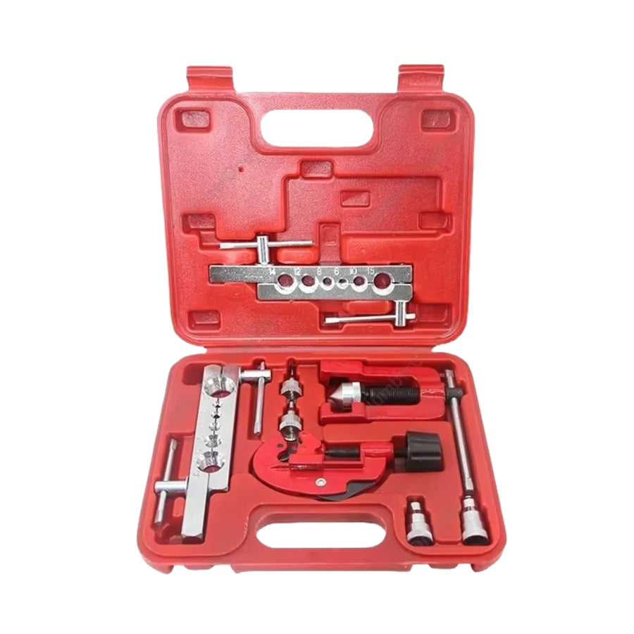 Kompleten komplet orodja za razširjanje in perlanje cevi, idealen za delo z bakrenimi, aluminijastimi in medeninastimi cevmi. Primeren za popravila zavor, montažo klimatskih naprav, centralnega ogrevanja, hladilnikov ter drugih sistemov, kjer je potrebna natančna obdelava cevi.