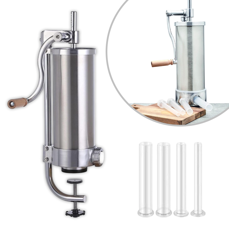 Ta polnilnica za klobase je izdelana iz vrhunskih materialov, vključno z aluminijem in nerjavečim jeklom (INOX 18/10), kar zagotavlja dolgotrajnost in odpornost proti koroziji. Z močnim prenosnim mehanizmom omogoča hitro in natančno polnjenje vseh vrst klobas, čevapčičev, krvavic, salam in drugih mesnih specialitet.