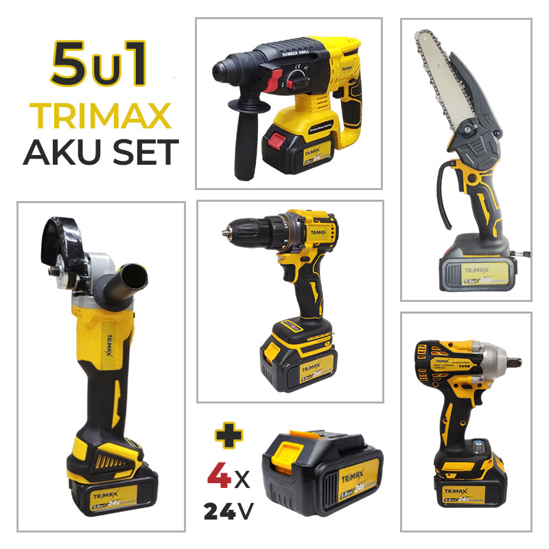 Kompletu so priložene skupaj 4 baterije 5AH Li-ion, ki omogočajo neprekinjeno delo brez pogostega polnjenja. Vse baterije so združljive z vsemi orodji Trimax, Garten Kaiser in Makita.